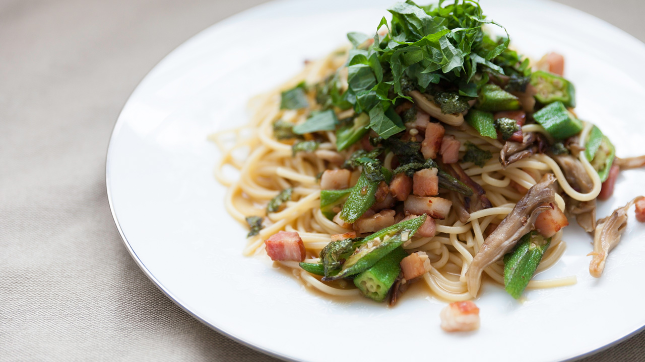 イタリアンが和風になる!大葉を使ったパスタです。フライパンにオリーブオイルをひき、食べやすい大きさに切ったベーコンと、えのきやしめじなどを炒めます。かためにゆでたパスタを入れてバターや醤油、塩、こしょうなどを加えて混ぜ、最後に大葉のオリーブオイルづけをのせたら完成です。