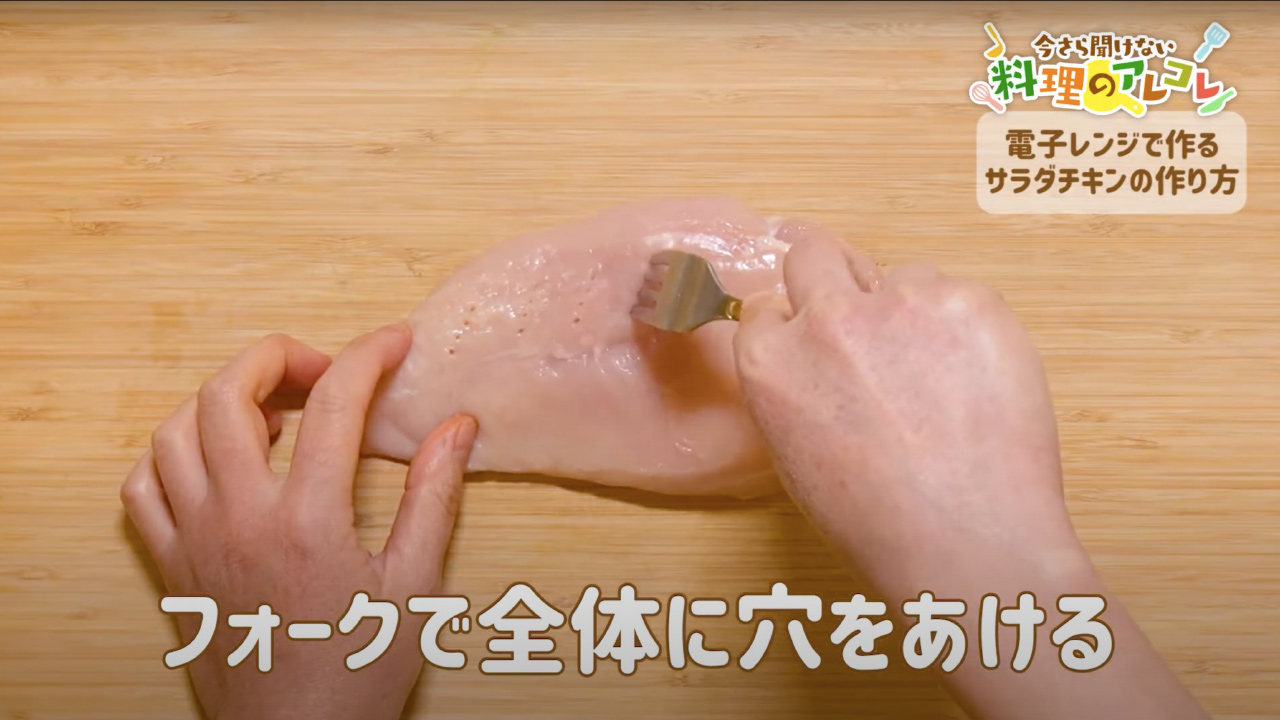 フォークで鶏むね肉に穴をあけておくと、焼き縮みを抑えてやわらかい食感に仕上がるんだ。下味も通りやすくなるぞ!