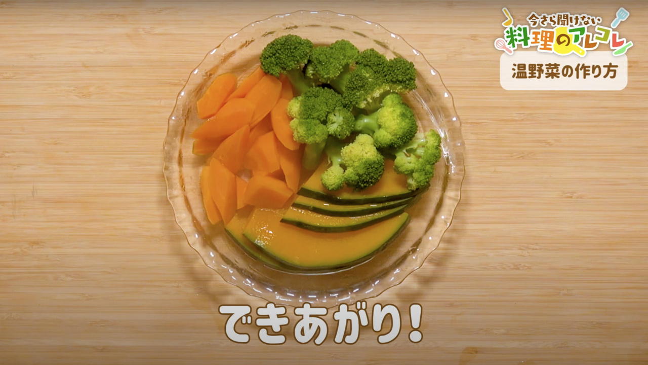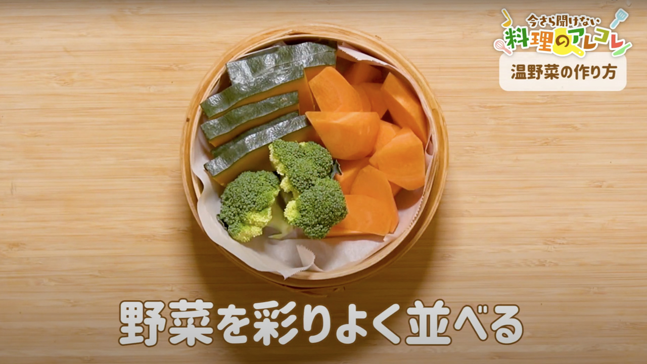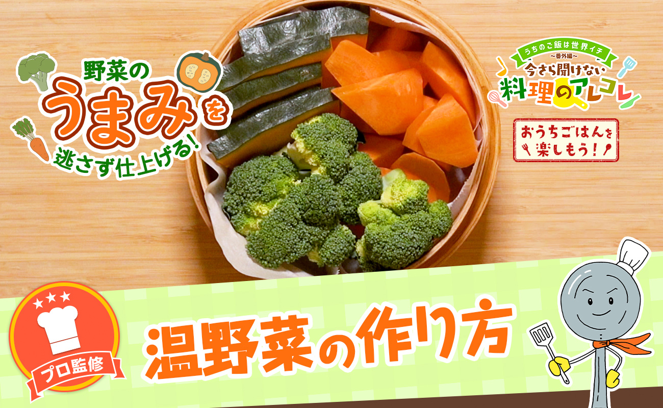 「うちのご飯は世界イチ」の番外編、お料理の基本をご紹介するミニレッスンへようこそ。第155回は、寒い季節に人気の「温野菜のレシピ」です。野菜の栄養を逃さず美味しく調理する方法を動画でご紹介します。