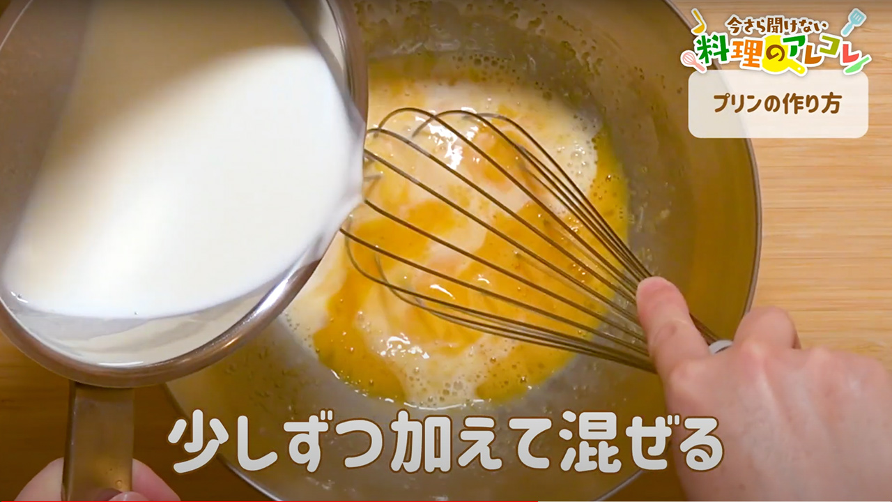 プリンは「す」ができやすい。原因の1つは、生地の中の「空気」なんだ。卵は空気を抱え込みやすいから、泡立てると気泡ができて、それが焼いたときに固まって「す」になってしまうんだ。だから、泡立てないようにしよう!泡立て器をボウルの底に当て、ぐるぐると回す程度でいいんだぜ!