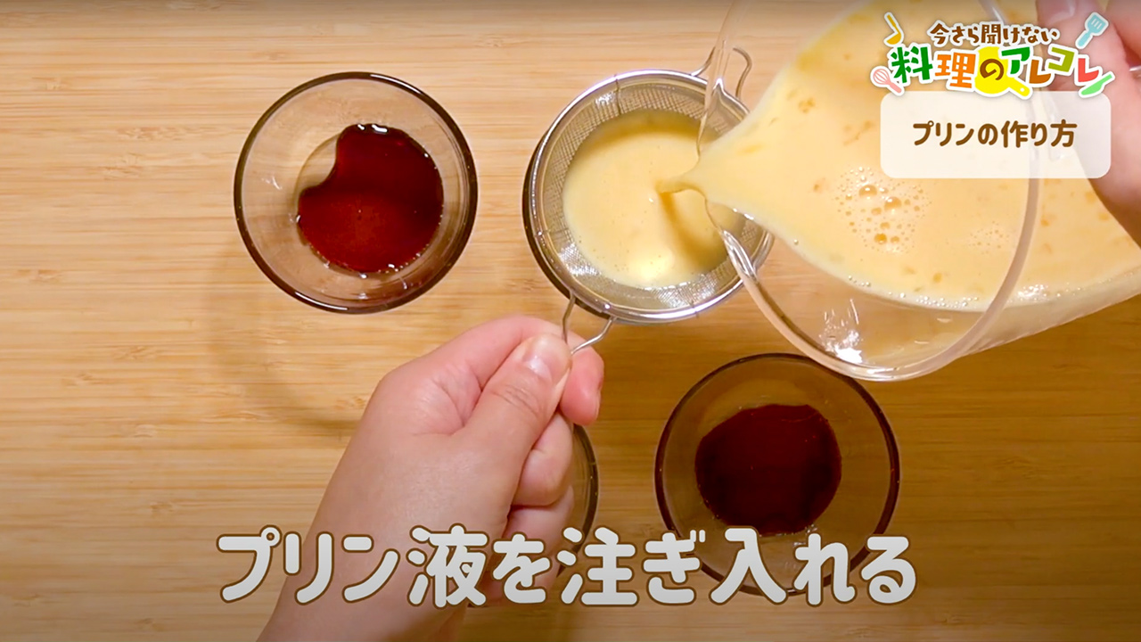 カラメルソースを入れたプリンカップに茶こしをのせて、プリン液を注ぎ入れます。