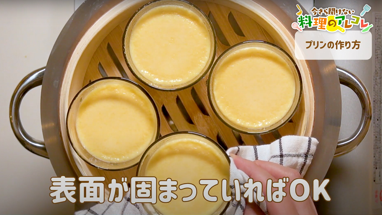 ステンレスやアルミの蒸し器の場合は、ほかの蒸し料理を作るときと同様に、蓋をふきんで包もう!蓋に付いた蒸気が水滴になって落ちると、仕上がりが水っぽくなってしまうからな。ふきんで蓋を包めば、ふきんが蒸気を吸い取るから、なめらかなプリンができあがるんだ。ただし、せいろの場合はふきんは不要だぜ!