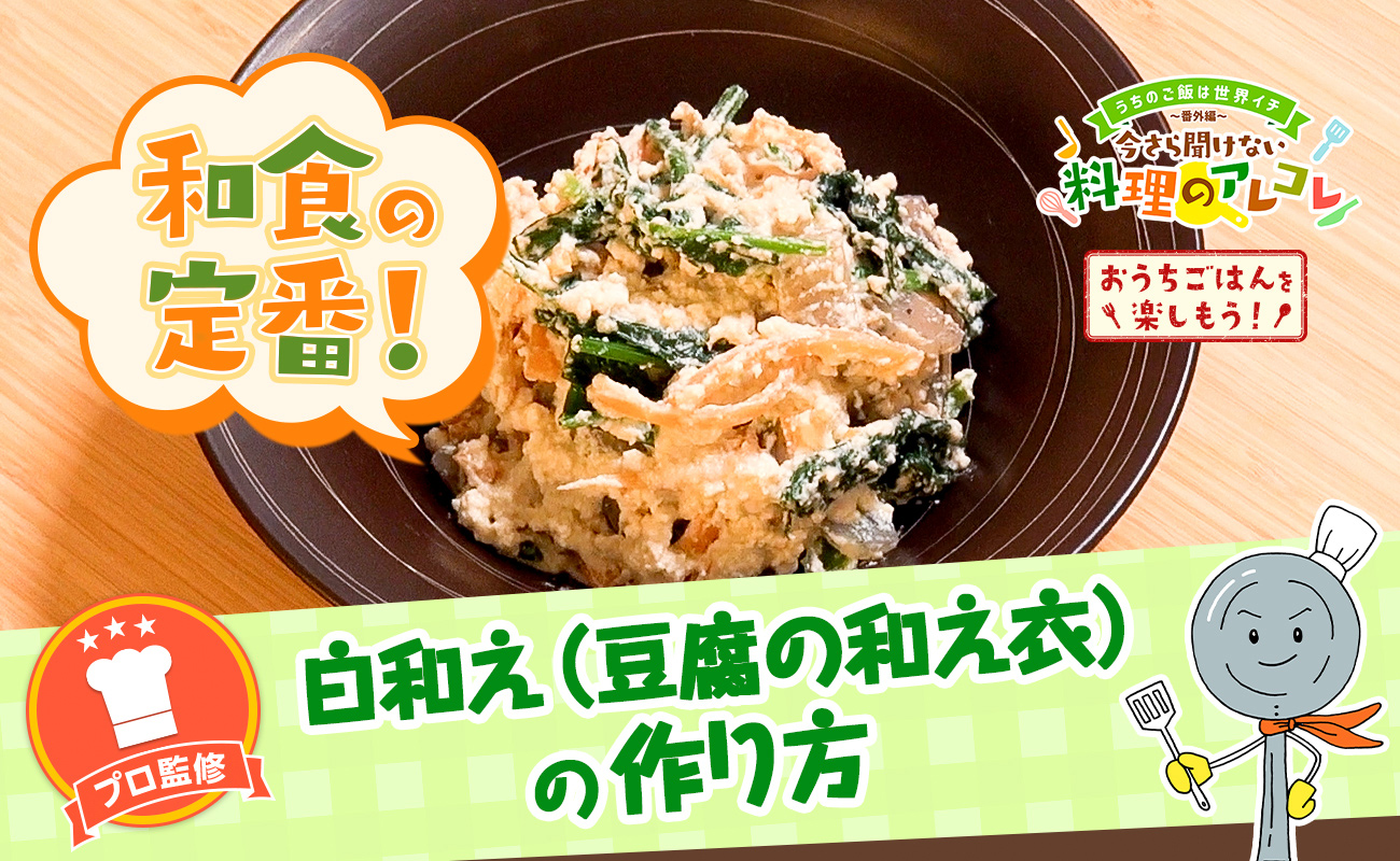 「うちのご飯は世界イチ」の番外編、お料理の基本をご紹介するミニレッスンへようこそ。第158回は、「白和えのレシピ」です。体に優しく、アレンジやリメイクの幅が広い、和食の定番である白和えの作り方を動画でご紹介します。