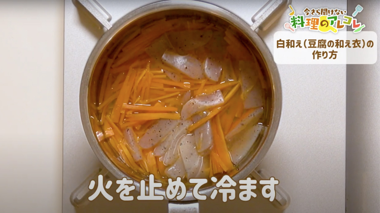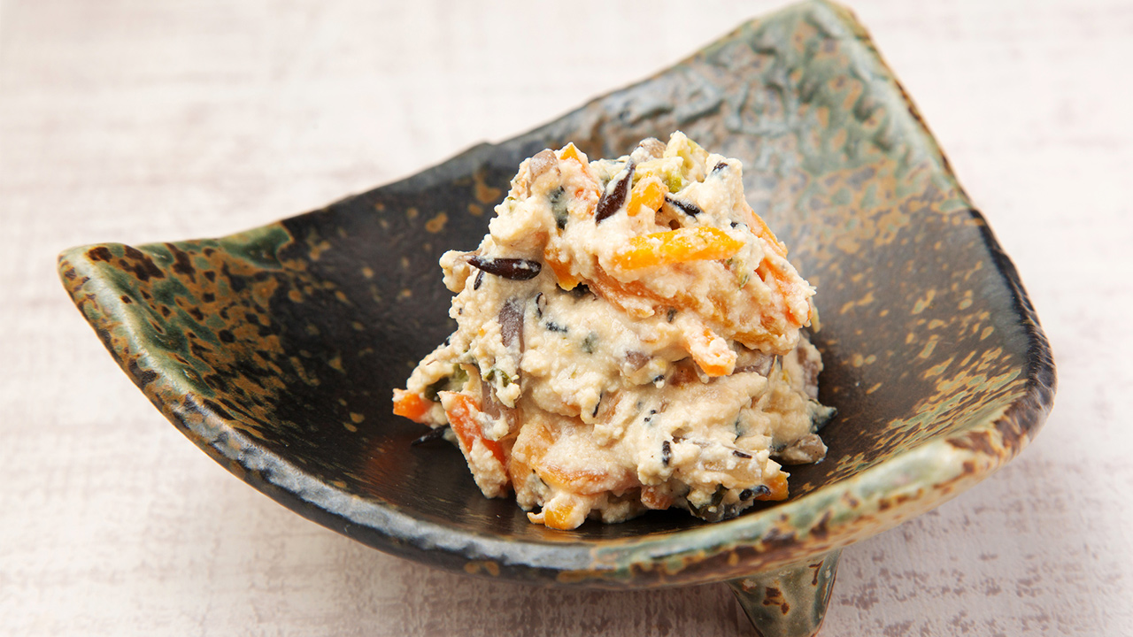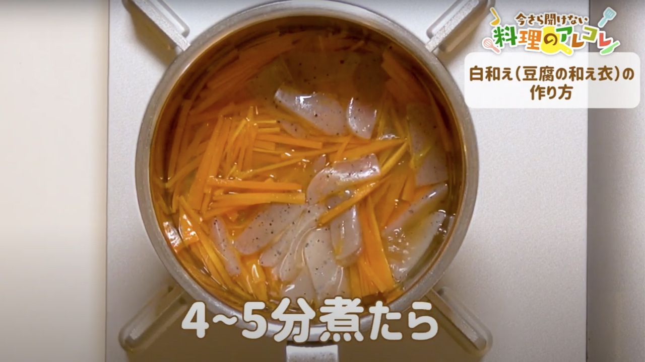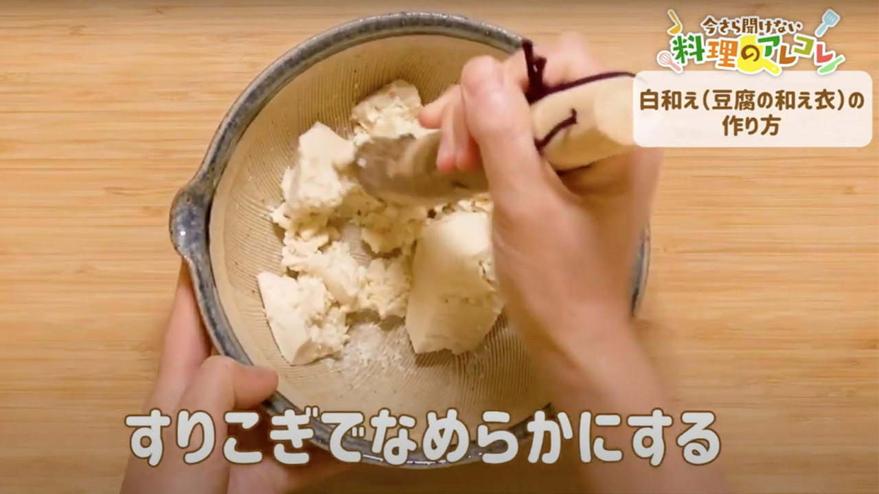 白和えは、豆腐、白ごま、白味噌の「白を和える」ことから名付けられた料理。食材が白い衣をまとっているように見えることから「和え衣」と呼ぶこともあります。