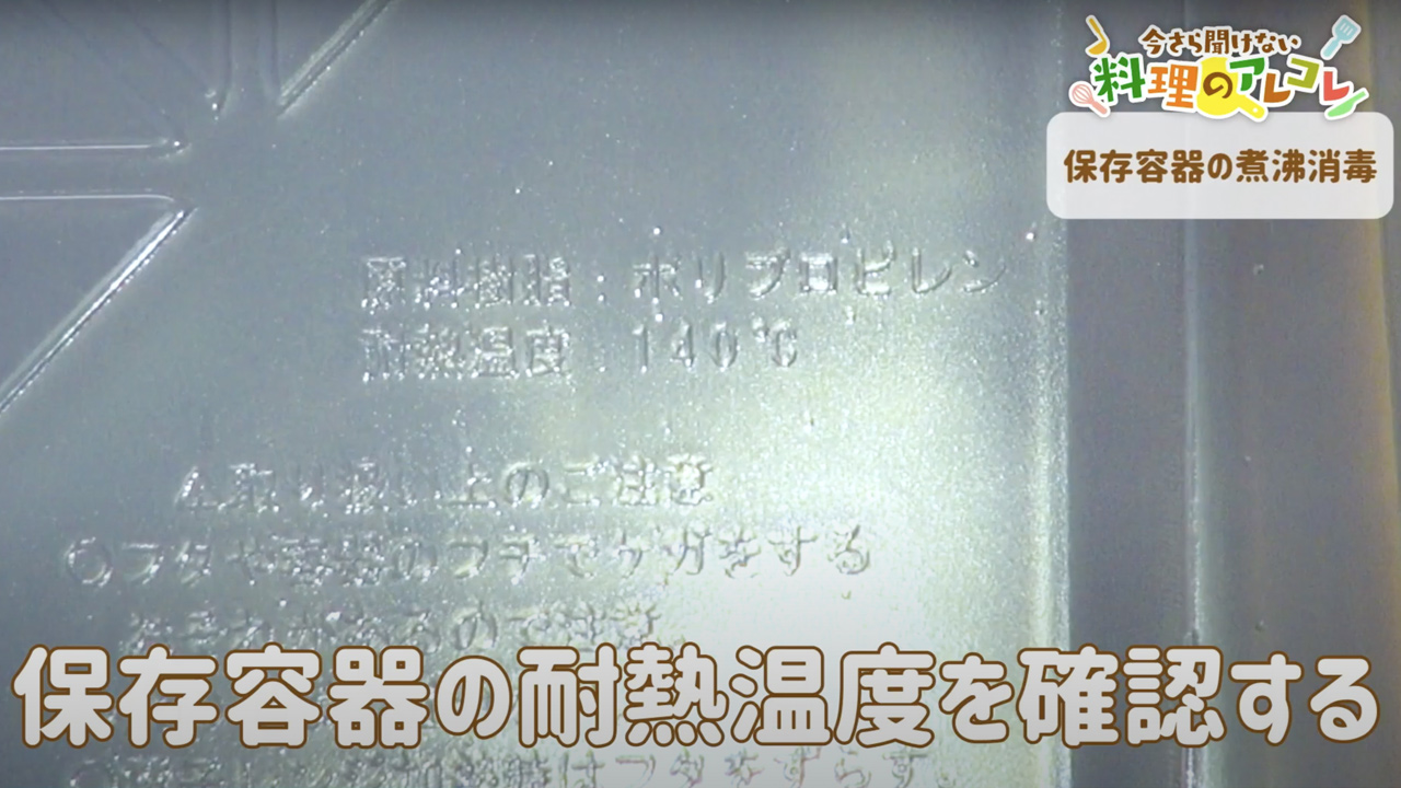 プラスチック保存容器の耐熱温度が100度以下だと、容器が変形してしまうから、煮沸消毒はできないぜ。耐熱性かどうかは、容器に貼ってあるラベルや容器に書いてある表示を見て確認しよう!