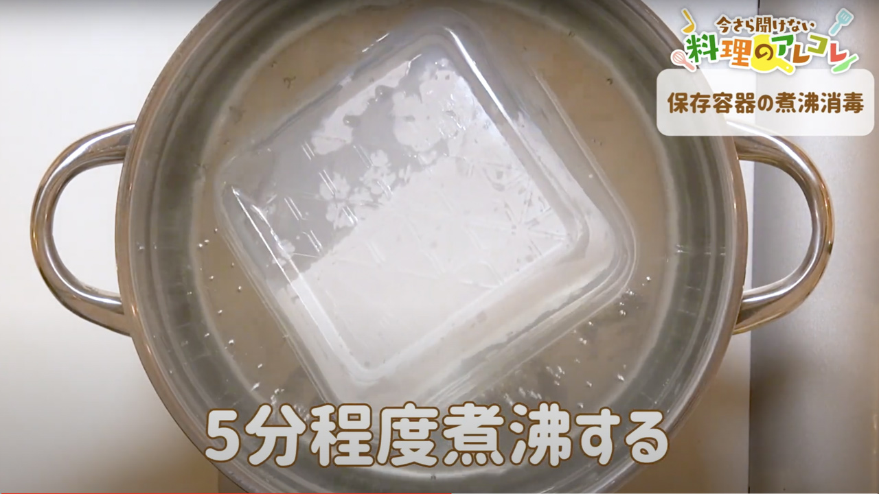沸騰したらプラスチック保存容器を入れ、5分程度煮沸します。