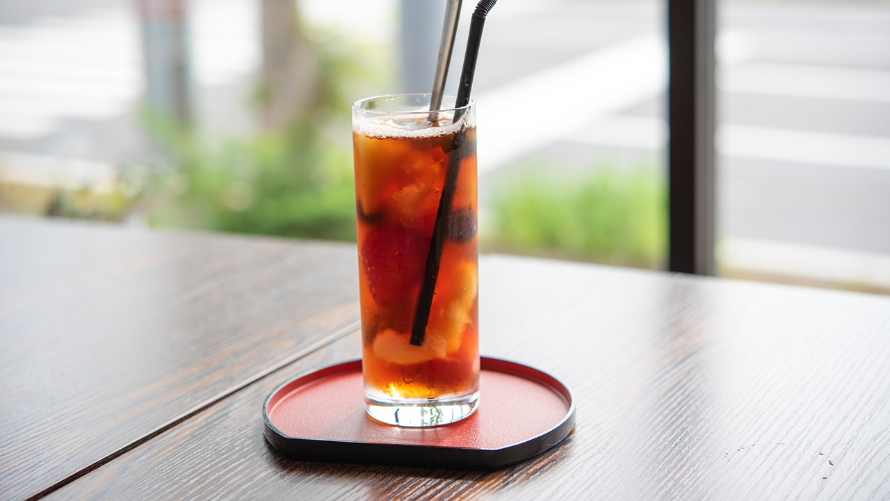 フルーツをたっぷり入れて、さわやかな甘みを楽しむアイスティーです。キウイ、オレンジ、レモンを輪切りにし、いちごは半分に切り、グラスに入れます。別の容器で作ったアイスティーをグラスに注いだら完成です。フルーツの甘みと酸味が紅茶によく合い、華やかな味わいを楽しめます。