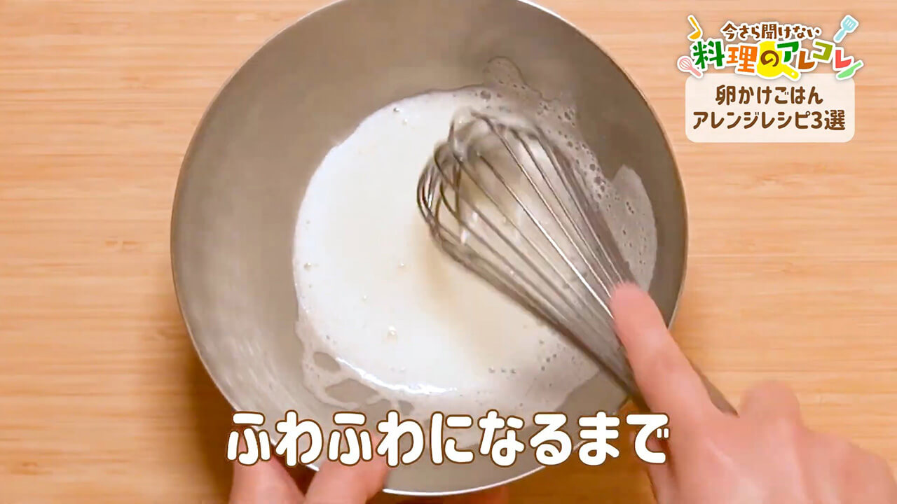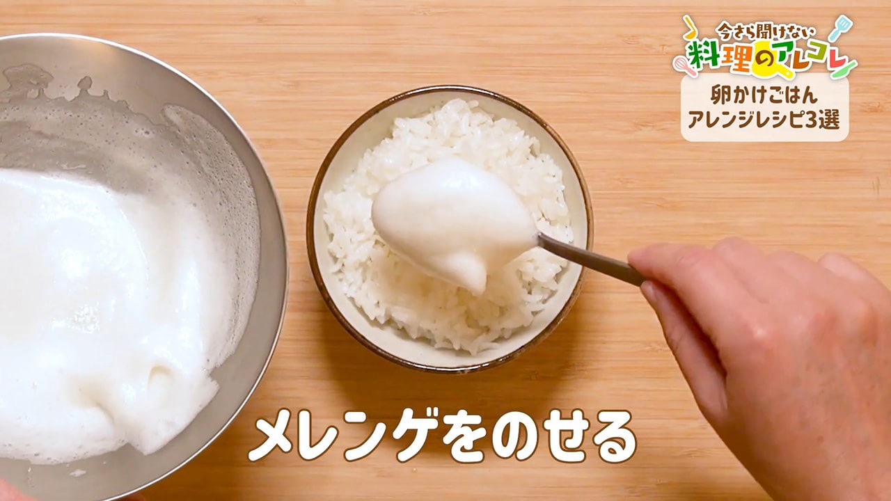 メレンゲをのせるだけでスイーツのような見た目とふわふわの食感を楽しめる、新しい卵かけごはんです。味付けは塩と醤油だけでシンプルに仕上げます。