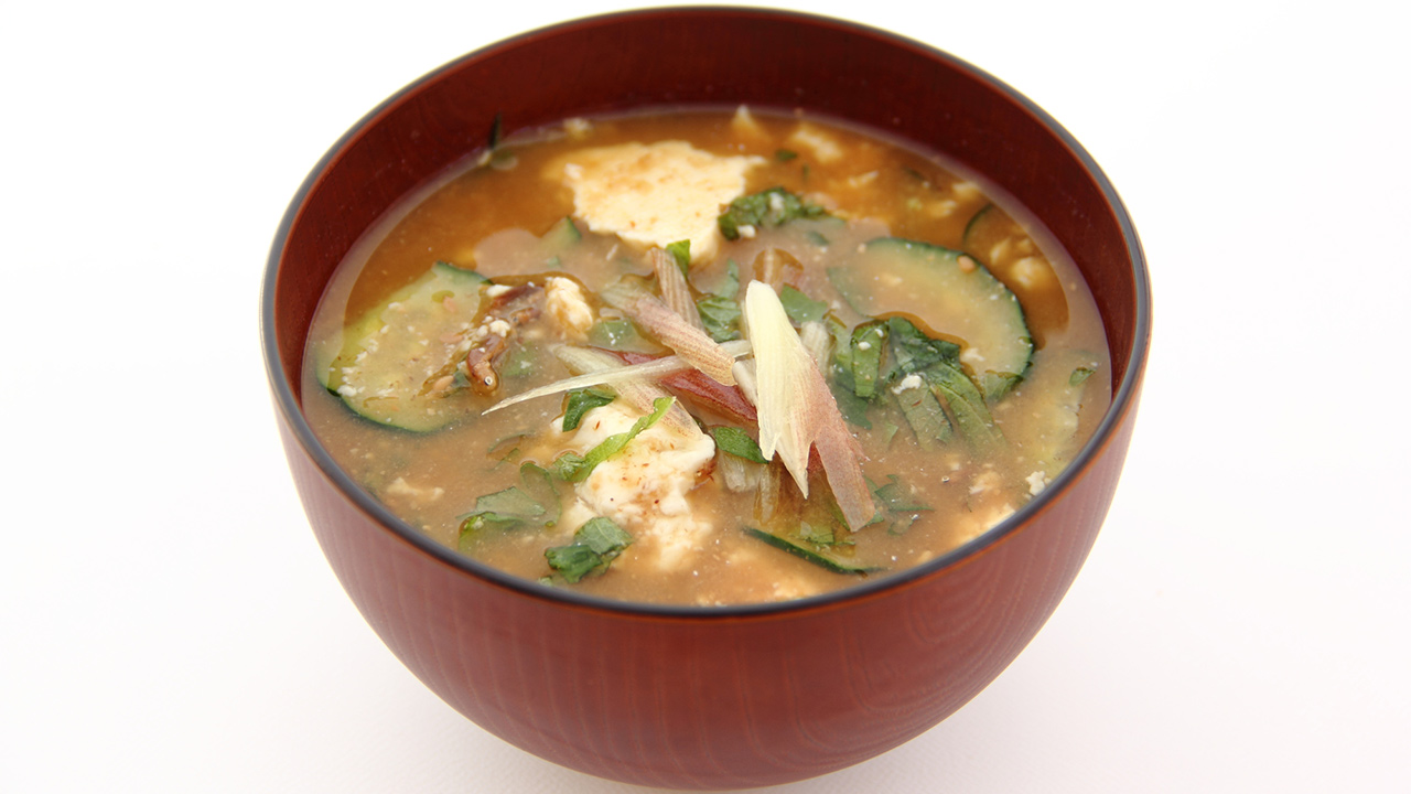 味噌を少量のお湯で溶きのばしたら、冷水で薄めて氷を浮かべます。暑い夏にピッタリの味噌汁です。輪切りにしたきゅうりと、薬味をたっぷり加えて召し上がれ。