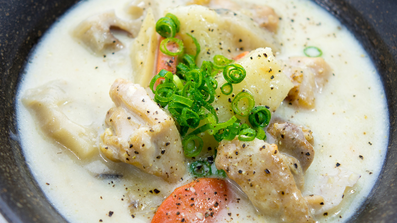和風だしの代わりにコンソメを使って、洋風だしベースに。食材をオリーブオイルでサッと炒めてから作ると、コクが出ます。どの味噌を使ってもよいのですが、白味噌で作るとよりやさしい味わいになります。