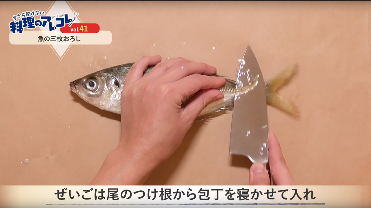 ぜいごは、尾の付け根から包丁を寝かせて入れ、上下に小刻みに動かしてそぎ取ります。裏面も同様にそぎ取りましょう。