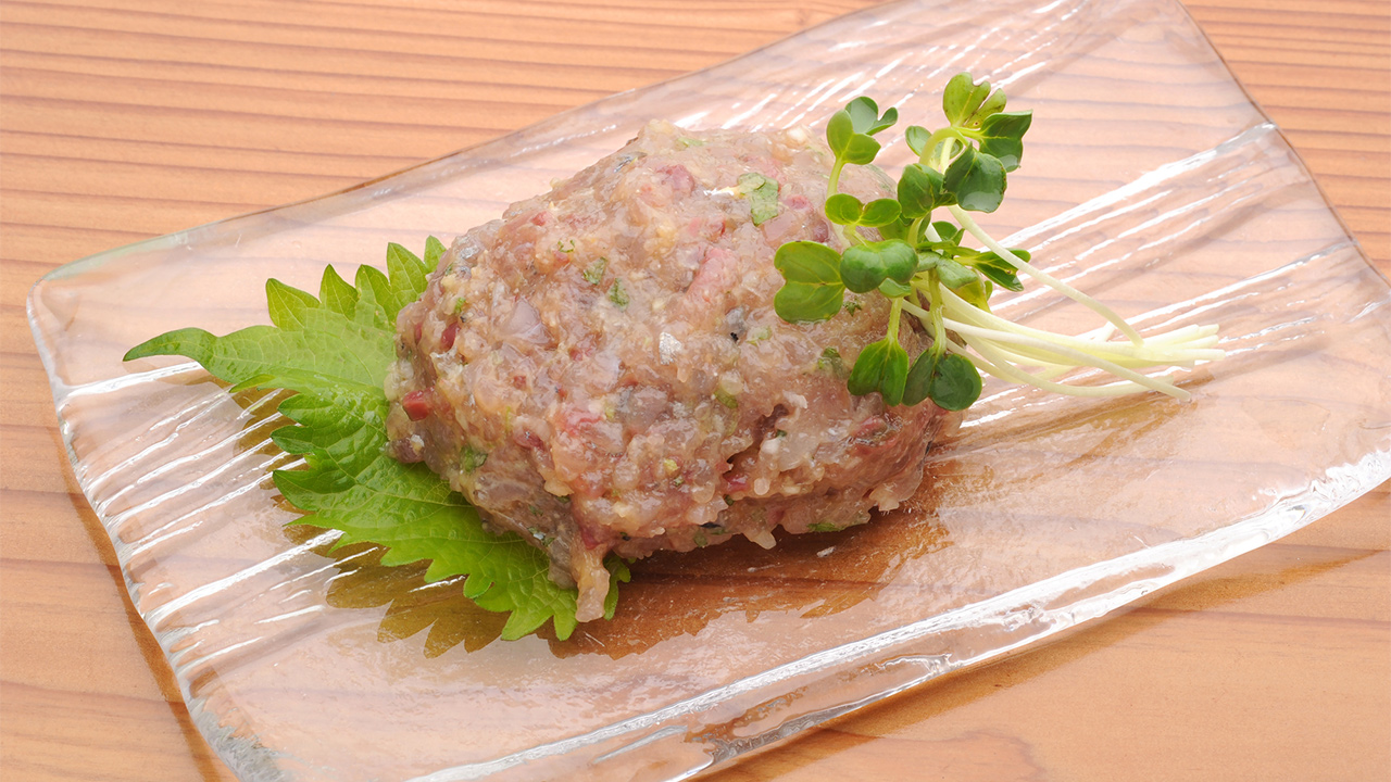 三枚におろしたあじの身を、包丁で叩いていきます。身が細かくなったら、生姜やねぎなどの薬味類、そして味噌を加えてください。さらに混ぜ合わせるように叩いていきましょう。よく混ざったら、お皿に盛り付けます。