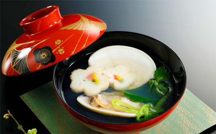 お正月の定番、お雑煮。地域によってお餅の形や、具や汁の味付けが異なりますが、関東ではすまし汁の中に角餅を入れたお雑煮が主流です。