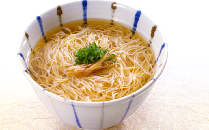 鍋にだし汁、酒、みりん、塩、薄口醤油を加え、強火にかけます。煮立ったら、半分に折ったそうめんを加え、しいたけ、しょうがなどお好みの具材を加えます。火が通ったら、刻み三つ葉やねぎを加えて器に盛り、完成!