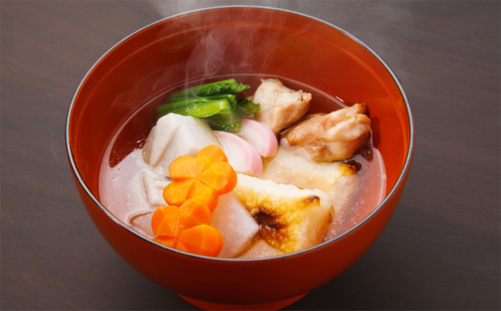 だし汁に短冊切りのだいこん、にんじんを入れ、煮立てた後に、塩と薄口醤油で味をととのえます。湯にさっと通した鶏肉をだし汁に加え火が通ったら、お椀に焼いた角餅、鶏肉、だいこん、にんじん、そのほか、かまぼこ、塩ゆでしたほうれん草、三つ葉、ゆずを盛り付け、すまし汁を注いででき上がりです。