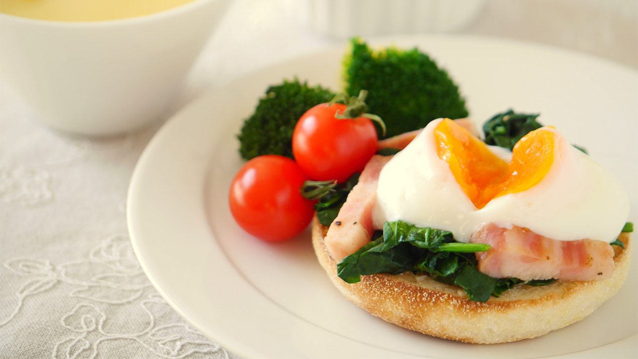 朝食のトーストを、温泉卵でボリュームアップ!チーズトーストやハムトーストなど、お好みの組み合わせでどうぞ。写真のように、食パンではなく円形のマフィンを使うのもおすすめです。