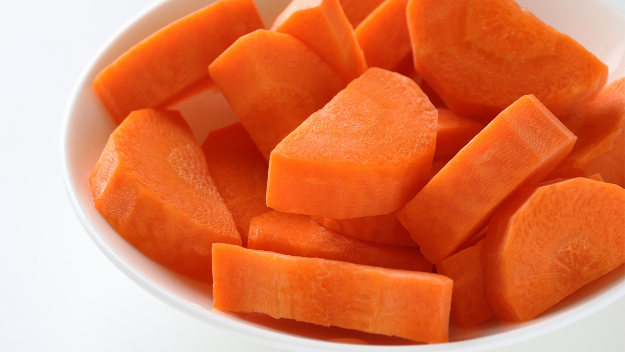 にんじんは皮をむいて、縦半分に切ります。切り口を下にして、端から一定の幅で切ってください。