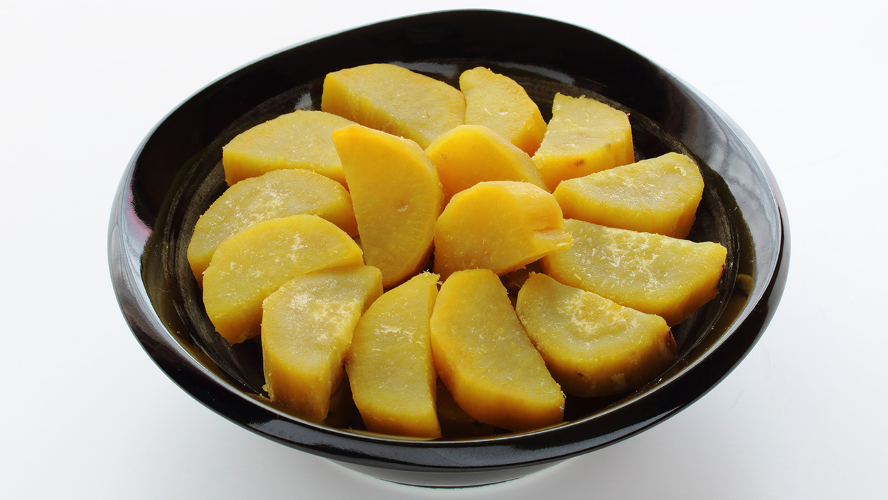 さつまいもは最初に両端を切り落として、縦半分に切ります。切り口を下にして、端から一定の幅で切ってください。
