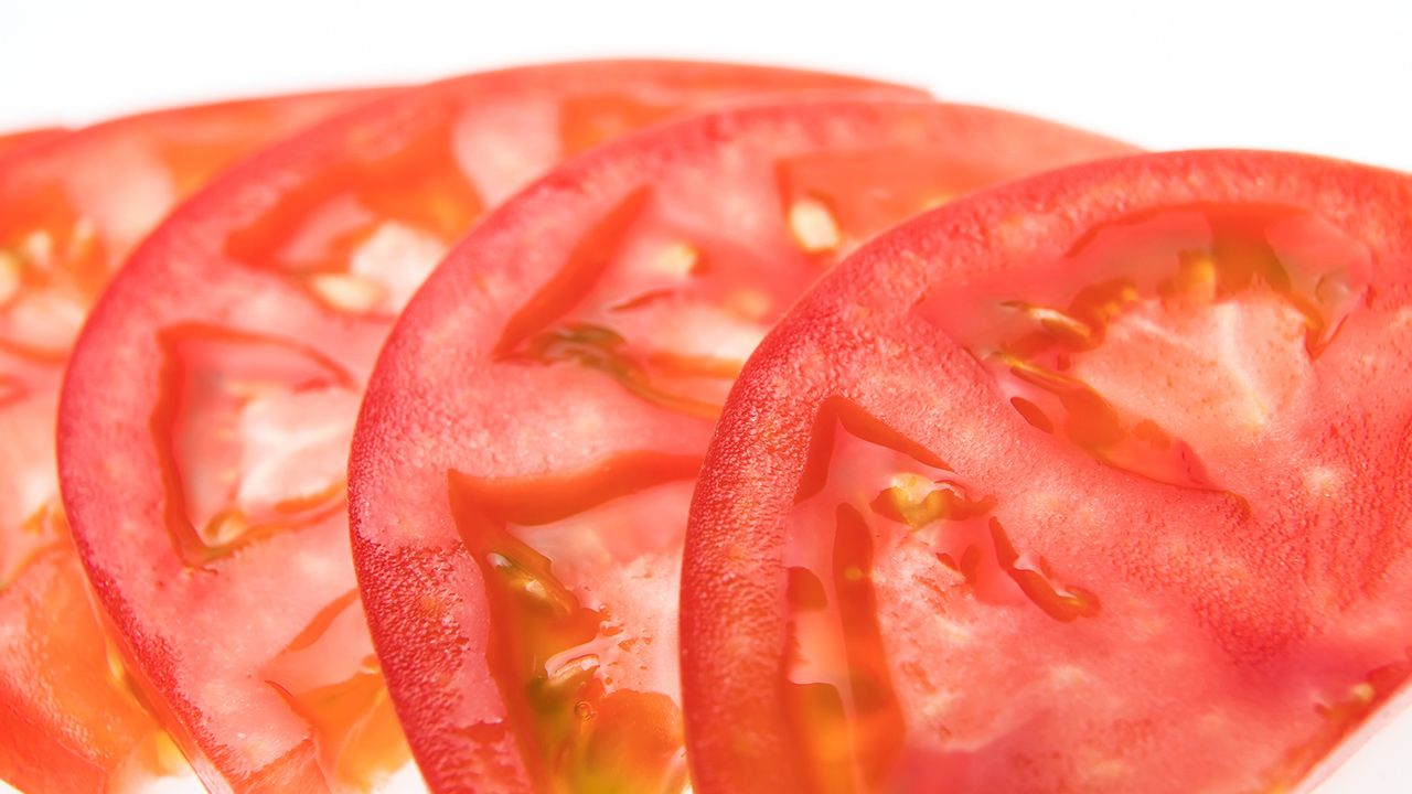 トマトは縦半分に切って、ヘタをとります。切り口を下にして、端から一定の幅で切ってください。
