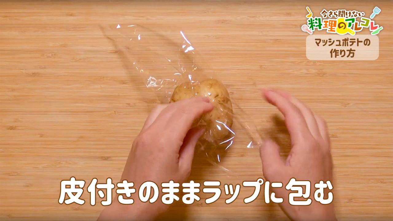 じゃがいもはよく洗い、皮付きのままラップに包みます。