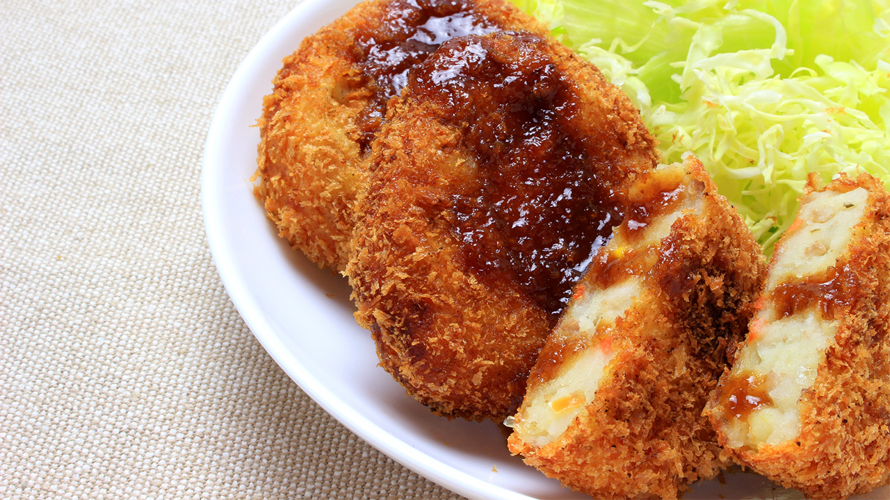 マッシュポテトのアレンジレシピといえば、やはり王道のコロッケ。丸型にまとめて小麦粉を付け、溶き卵にくぐらせてパン粉をまぶします。加熱した油でこんがりきつね色になるまで揚げたら、できあがりです。お好みで、ミックスベジタブルやツナなどを混ぜても美味しいですよ。