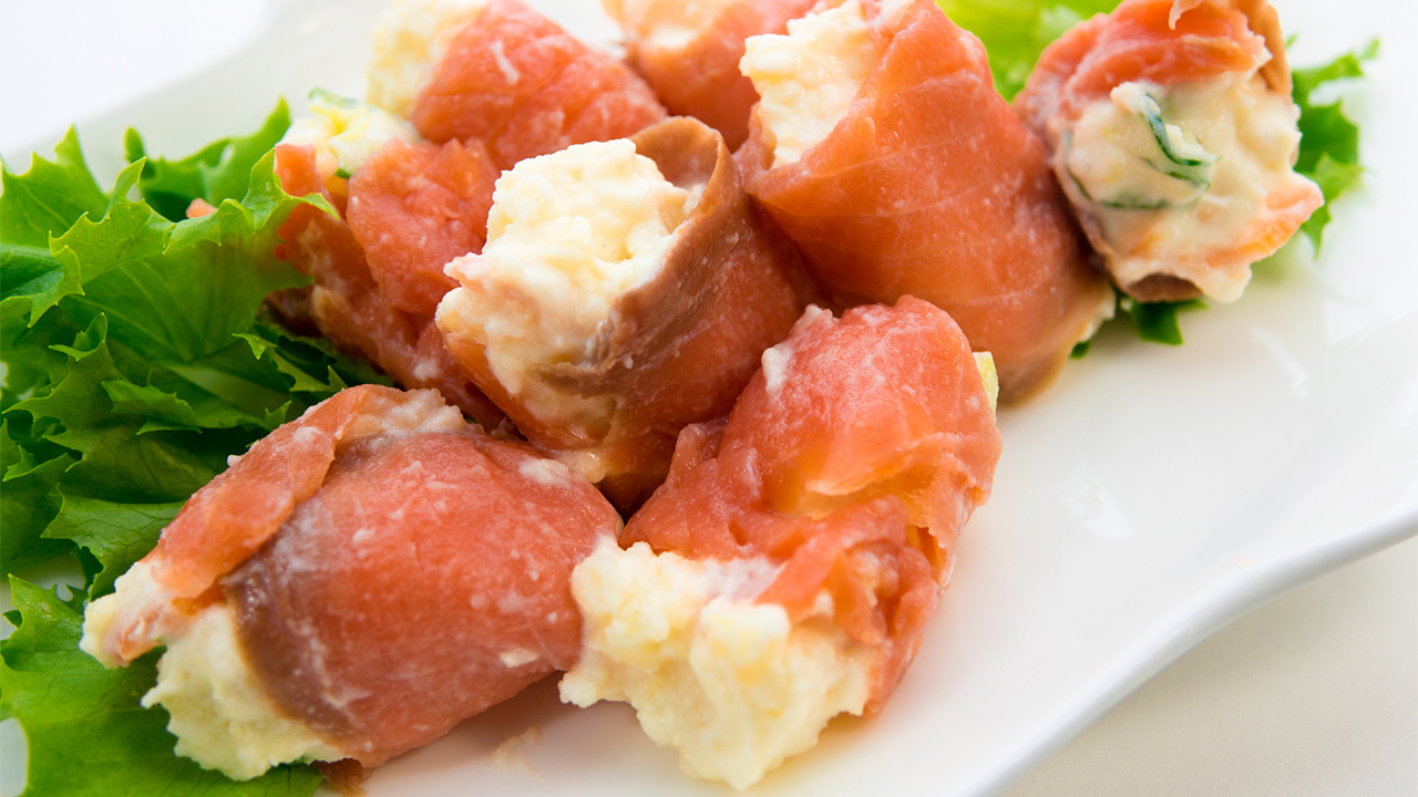 一口サイズにまとめたマッシュポテトを、スモークサーモンでくるっと巻くだけ。ピンク色の鮭と白いマッシュポテトの色合いが華やかで、パーティーのオードブルにぴったり!