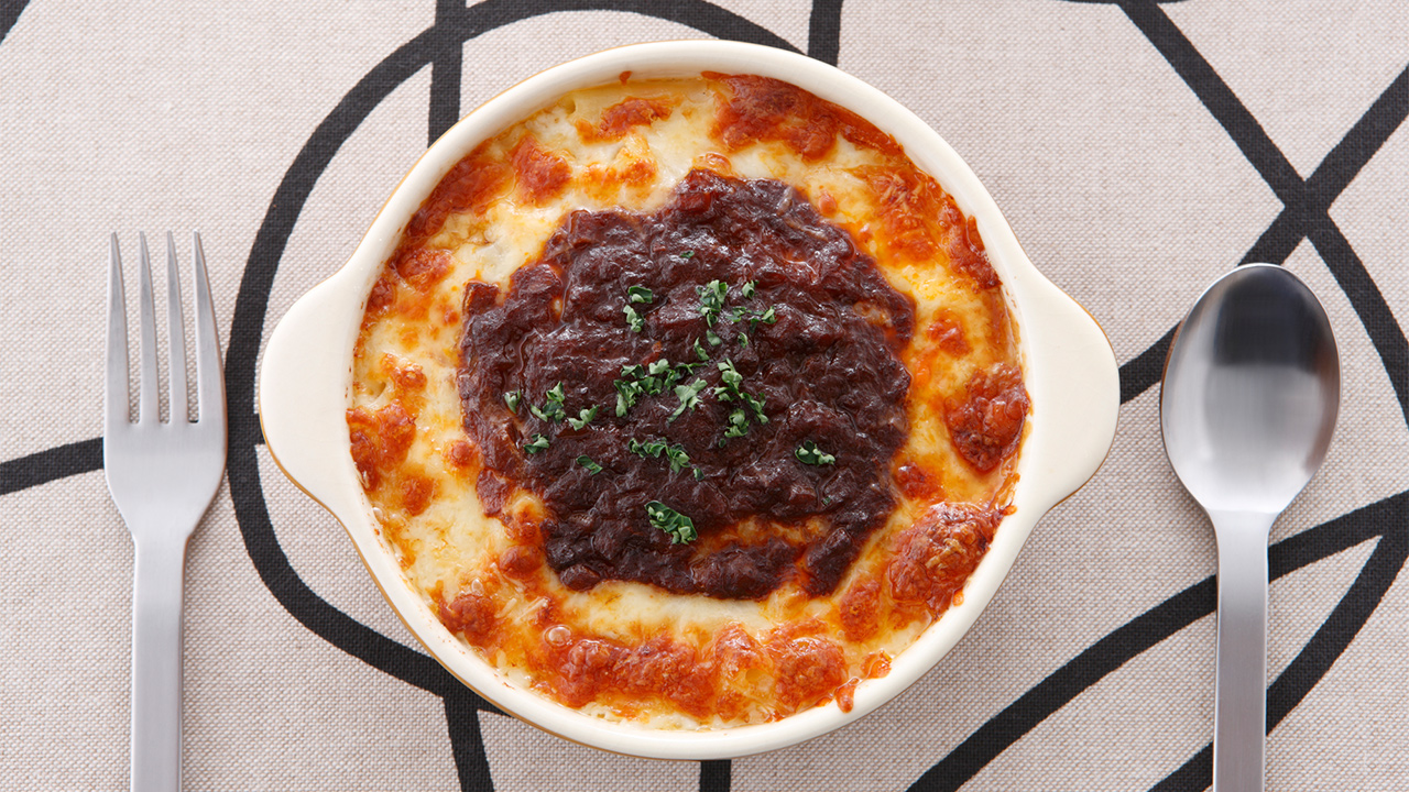 余ったマッシュポテトをグラタン皿に詰め、上からミートソースをたっぷりとかけます。ピザ用チーズをのせてオーブンで加熱し、こんがり焼き目がついたらできあがり。食べ応えがあり、子どもたちが大好きな味です。
