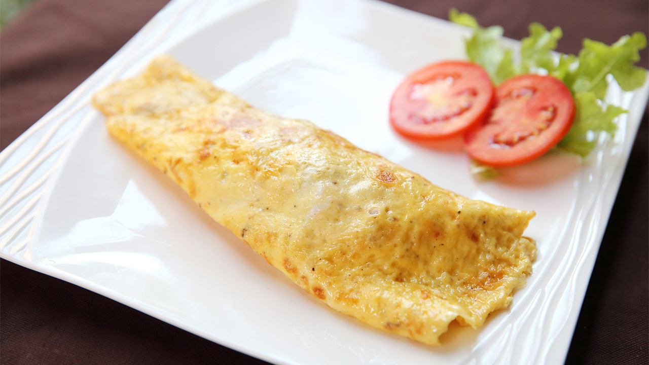 オムレツの卵液をフライパンに流し、手前にマッシュポテトを置いて奥から巻き、形を整えます。お好みで、溶けるチーズなどを加えても美味しくいただけます。