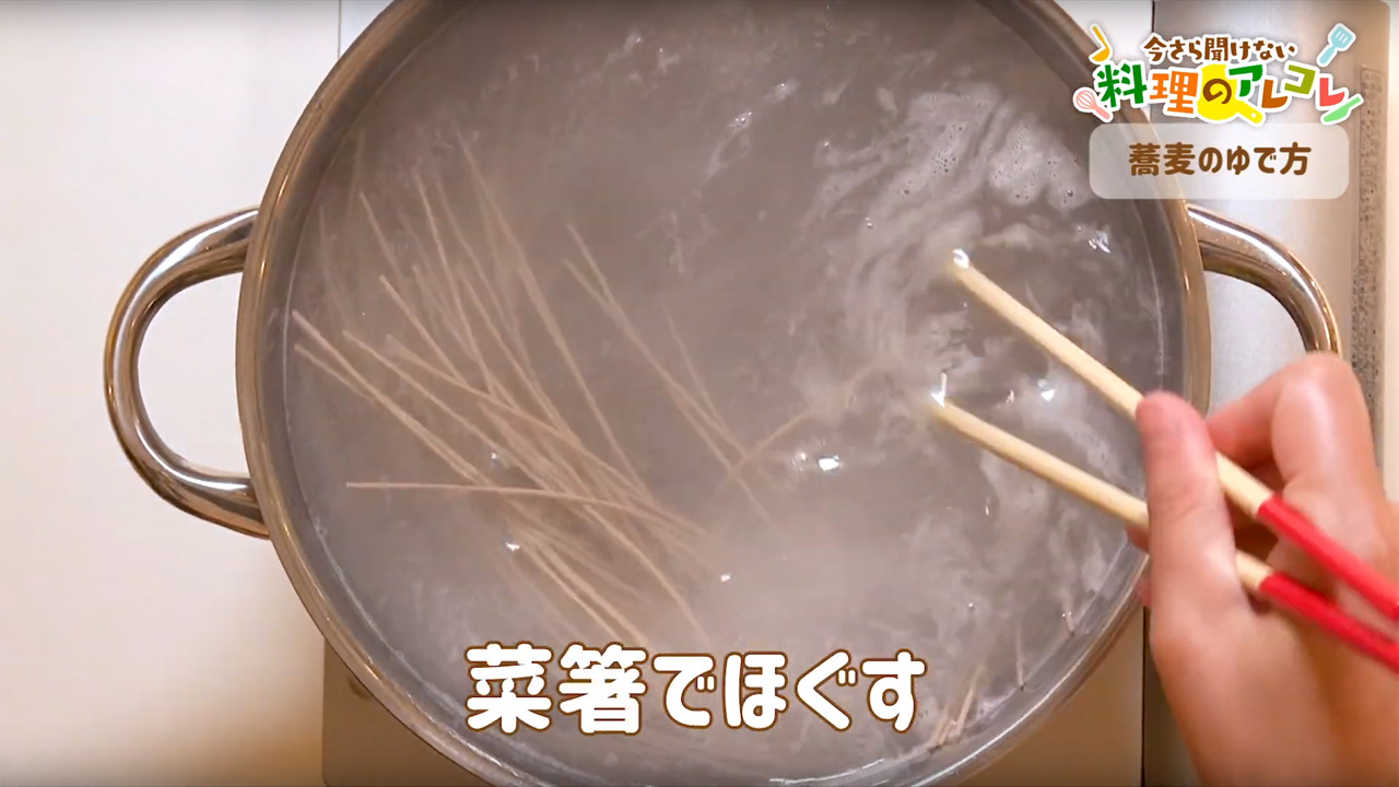 生蕎麦の場合は、あらかじめ手でほぐした麺を少量ずつ鍋に入れていきます。麺が固まらないように、菜箸で底からかき混ぜてください。