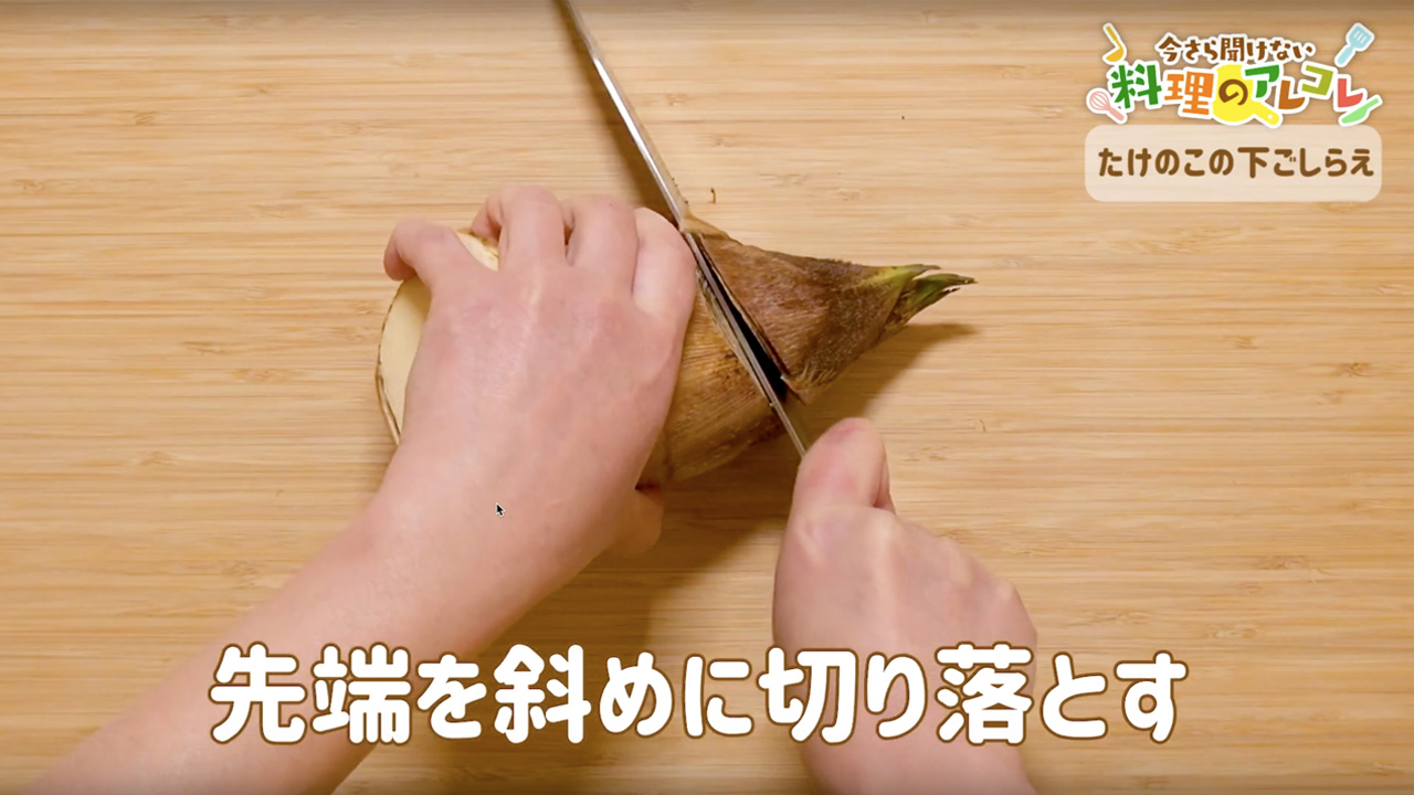 まず、たけのこの先端を、斜めに切り落としましょう。