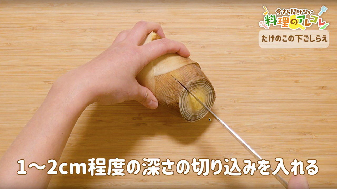 先端を斜めに切り落とすと、断面が広くなり、たけのこに熱が通りやすくなります。