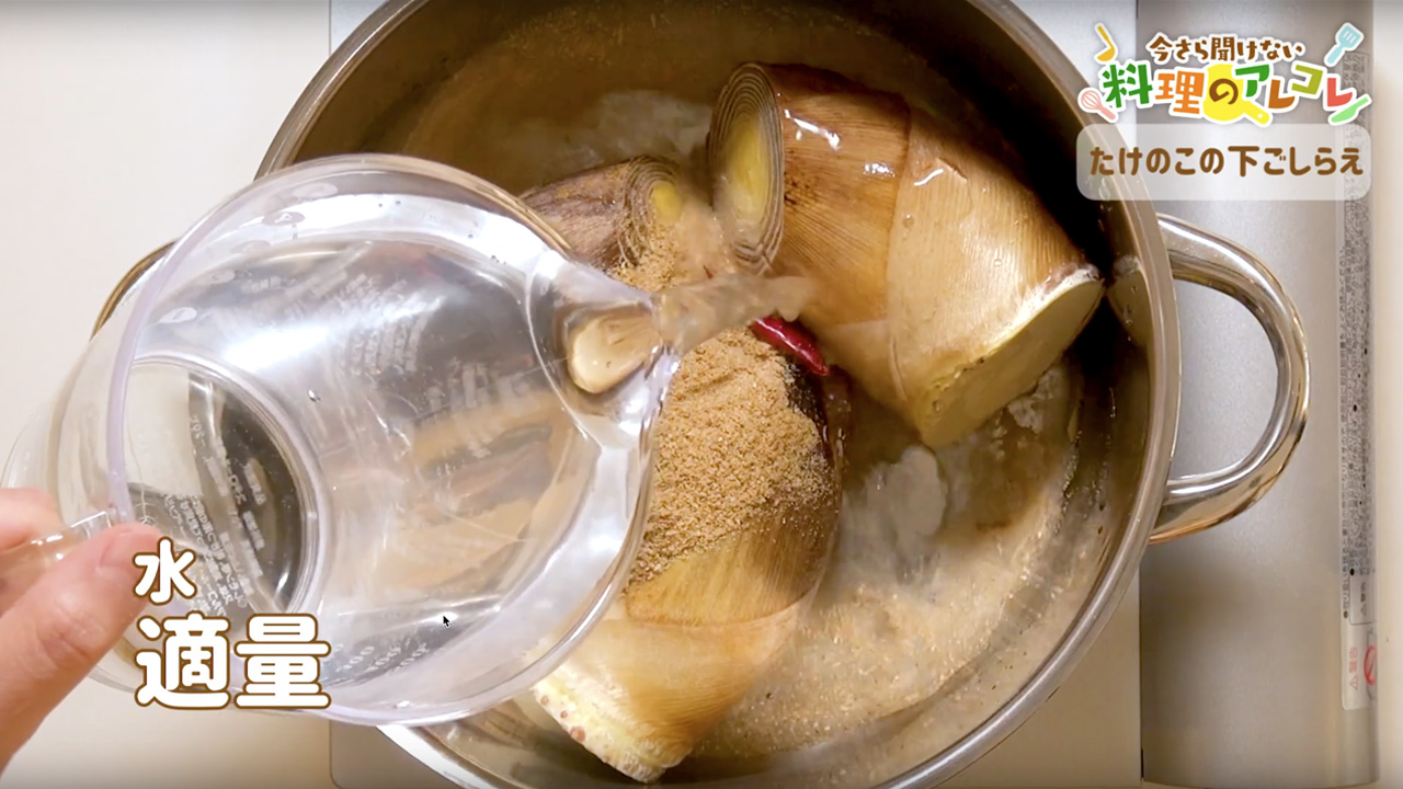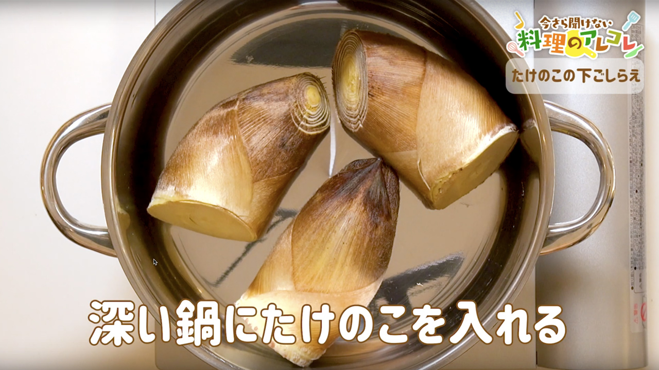 まず、たけのこを皮付きのまま、適度な大きさに切ります。鍋に切ったたけのこと米のとぎ汁、赤唐辛子を入れ、火にかけて落とし蓋をします。たけのこがやわらかくなったら火を止め、お湯が冷めるまで待てば完成です。