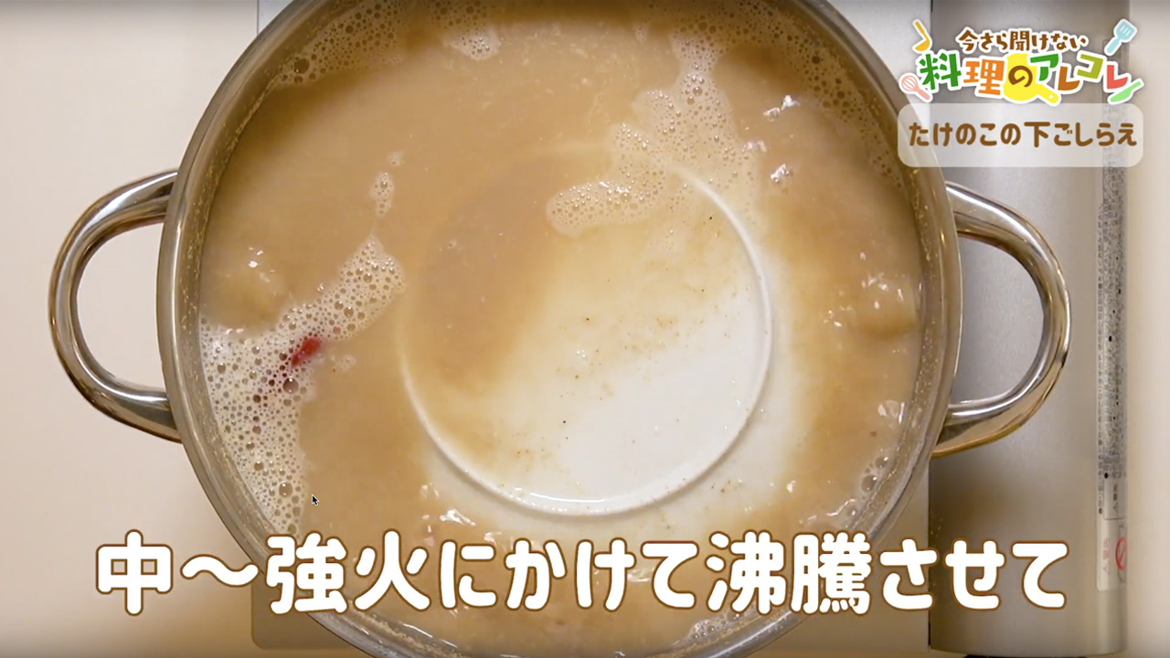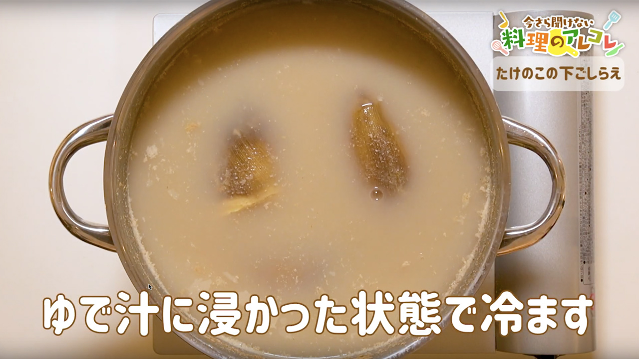 ゆであがったたけのこは、鍋に入れたまま、ゆで汁に浸かった状態で冷ましましょう。