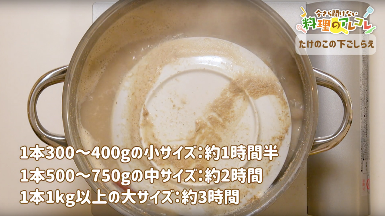 たけのこのアク抜きにかかる時間はたけのこのサイズによって変わります。