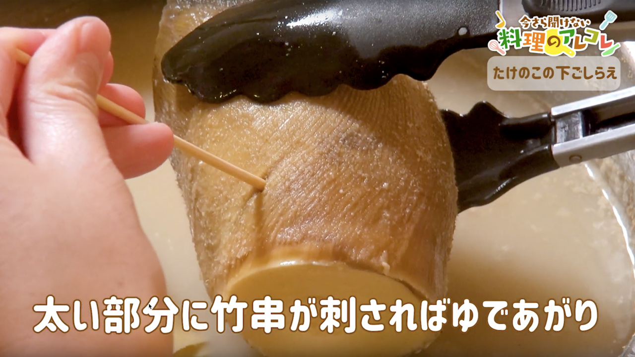 目安時間通りにゆでたら、たけのこを1本すくい上げます。