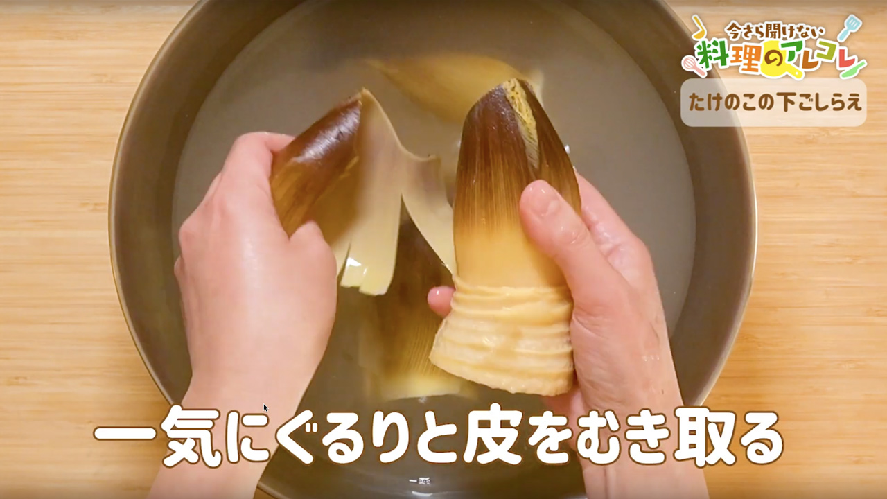 たけのこを美味しく食べるには、皮をむかずにアク抜きするのがポイントだぜ。皮付きのままゆでることで、うまみを逃さずにアクを抜くことができるんだ。外側の泥が気になるときは、2~3枚だけむいておこう。