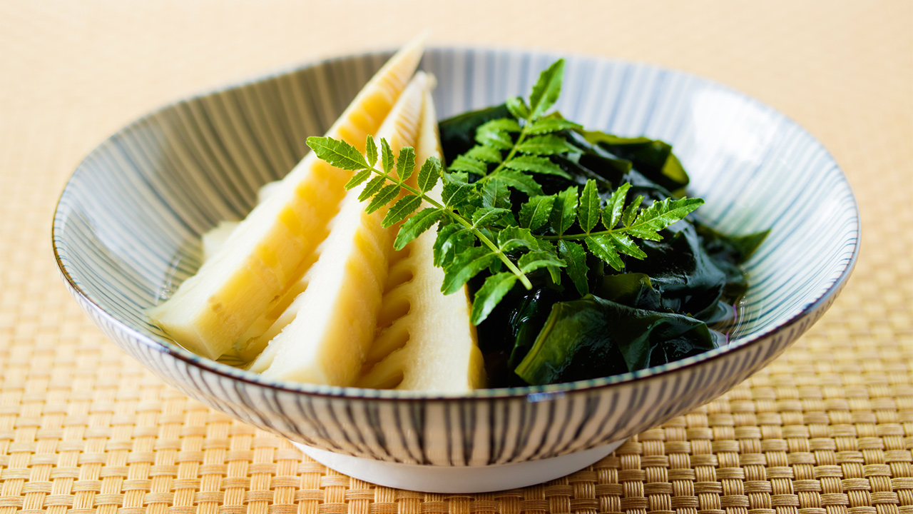 たけのこを薄切りにします。わかめは水で戻すなど下ごしらえをして、食べやすい大きさに切りましょう。鍋にだし汁、醤油、みりん、塩を入れ、たけのこを加えて3~4分煮ます。最後にわかめを加えて、火を止めて10分程度置いてください。器に盛り付けたらできあがり!