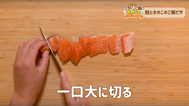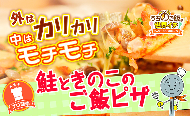 ご飯を使ったピザは、外はカリカリ、中はモチモチの仕上がり。旬の鮭ときのこをとろ~りチーズが包み込み、お子さまも大喜び間違いなしの一品です!