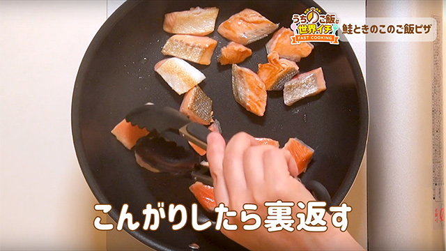 フライパンにオリーブオイル大さじ1/2を入れて中火で熱し、鮭を入れて焼きます。こんがりしたら裏返して、端に寄せてください。
