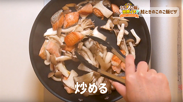 空いているスペースできのこを炒めて、鮭に火が通ったら全体を混ぜ合わせます。