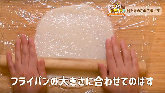 フライパンの大きさに合わせて、めん棒でご飯を円形にのばしてください。めん棒がない場合は、コップの底や手でのばしましょう。