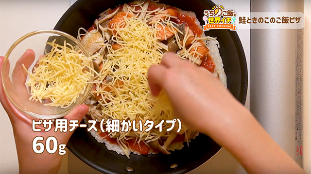 その上にピザ用チーズをのせ、蓋をしてチーズが溶けるまで中火で約3分焼きます。