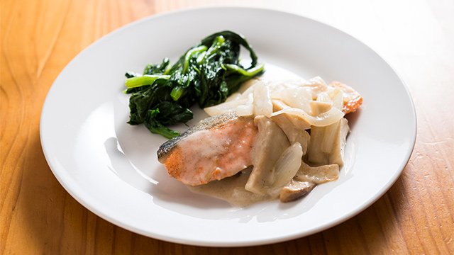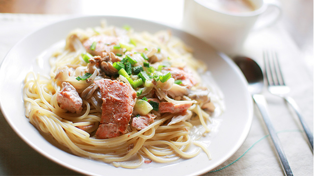 フライパンにオリーブオイルを入れて、きのこ、一口大に切った鮭、玉ねぎを塩・こしょうで炒めます。そこに水、白ワイン、味噌を入れ、沸騰したら好みのかたさにゆでたパスタを加えます。最後に生クリームを加えてさっと絡めたらできあがりです。