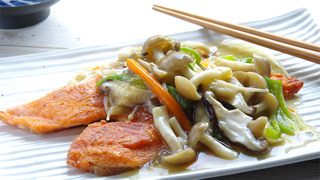 和風だしで作る、鮭ときのこのあんかけです。鮭は片栗粉をまぶして揚げ焼きにします。キッチンペーパーで油を拭き取ったフライパンで、玉ねぎ、にんじん、ピーマン、もやしを軽く炒め、めんつゆと水を加えて煮立たせます。水溶き片栗粉を入れて混ぜれば、とろ~り和風あんのできあがり。鮭の上にたっぷりかけていただきます!