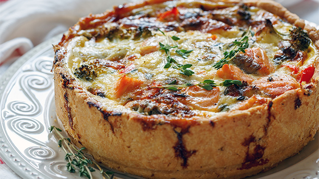 フライパンにバターを入れて、きのこ、一口大に切った鮭、玉ねぎ、ほうれん草を入れて炒め、塩・こしょうで味付けしたら皿に取り出してください。卵、牛乳、生クリーム、粉チーズ、コンソメの素、マヨネーズを混ぜ合わせた卵液に、冷ましておいた野菜を入れて混ぜ合わせます。冷凍パイシートを敷いた型に流し込み、200℃のオーブンで25分~30分焼いたら完成です!