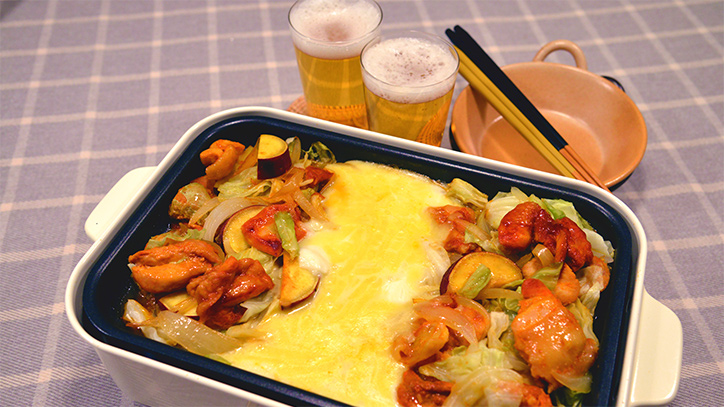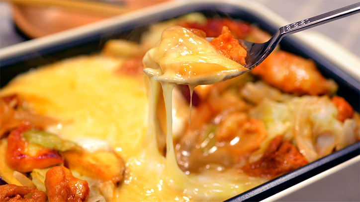 ピリ辛の鶏もも肉と野菜が、とろ~りチーズと相性バツグン!