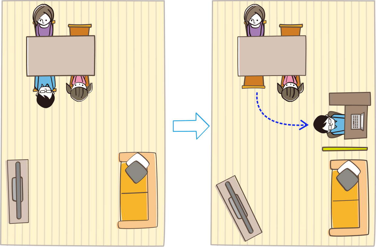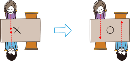 視線が向き合わない座り方に見直す。