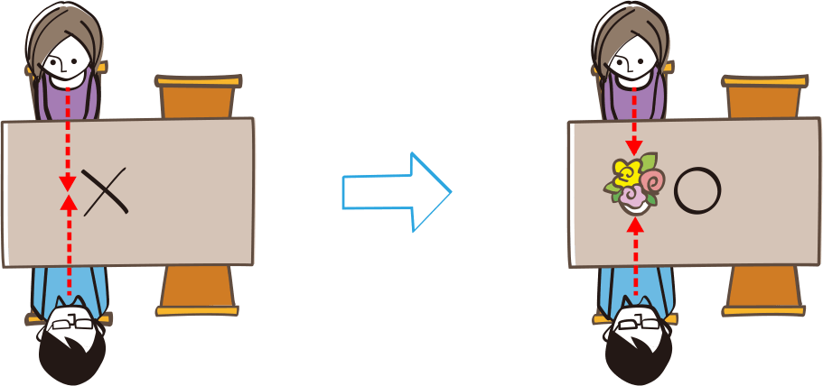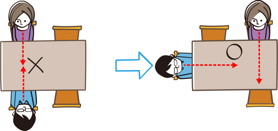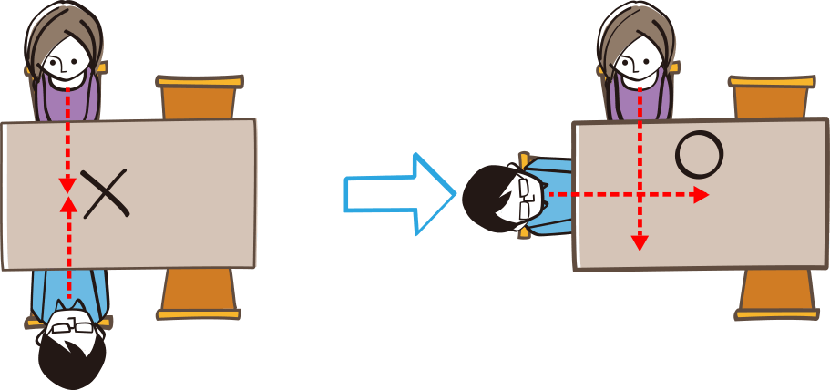 正面に向かい合わず、互い違いに座る