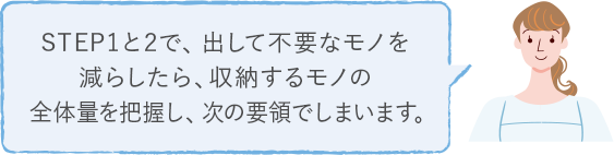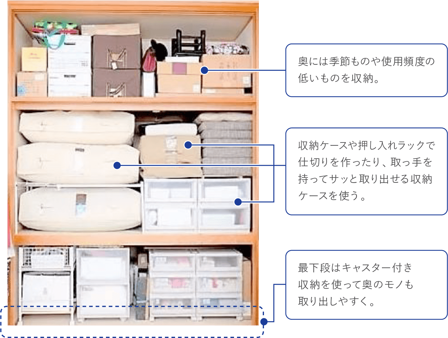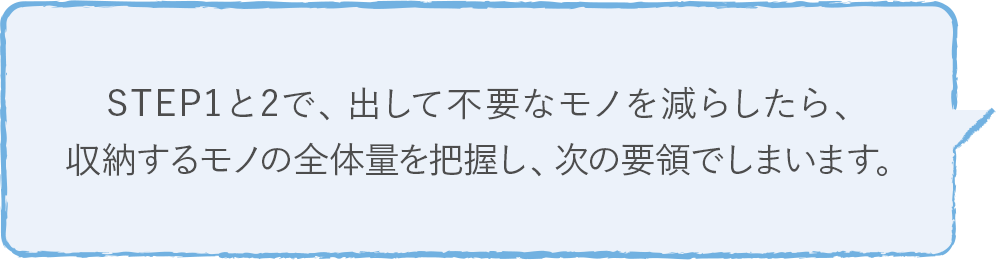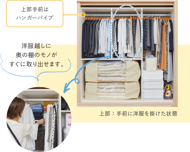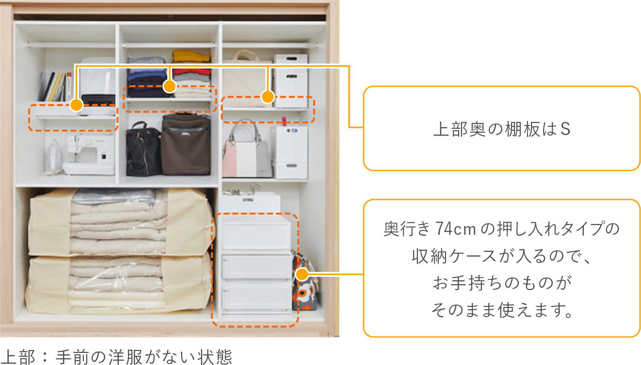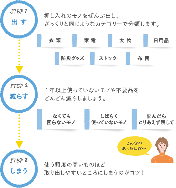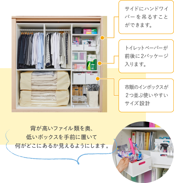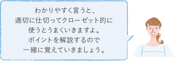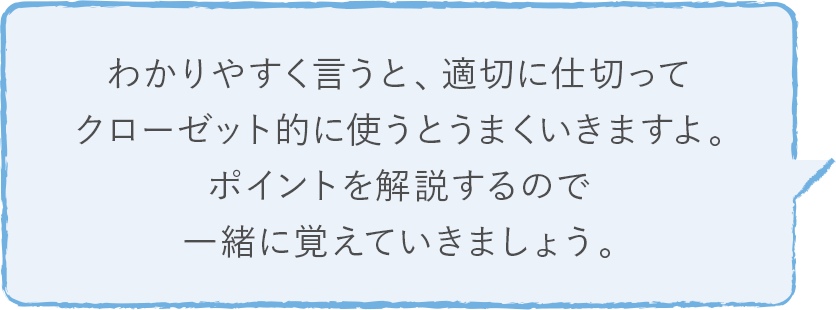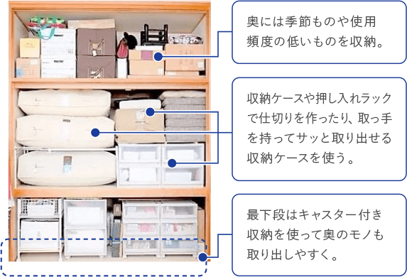 使用頻度で分けて、季節物などあまり使わないモノは奥に、