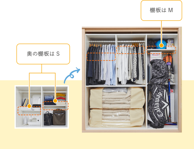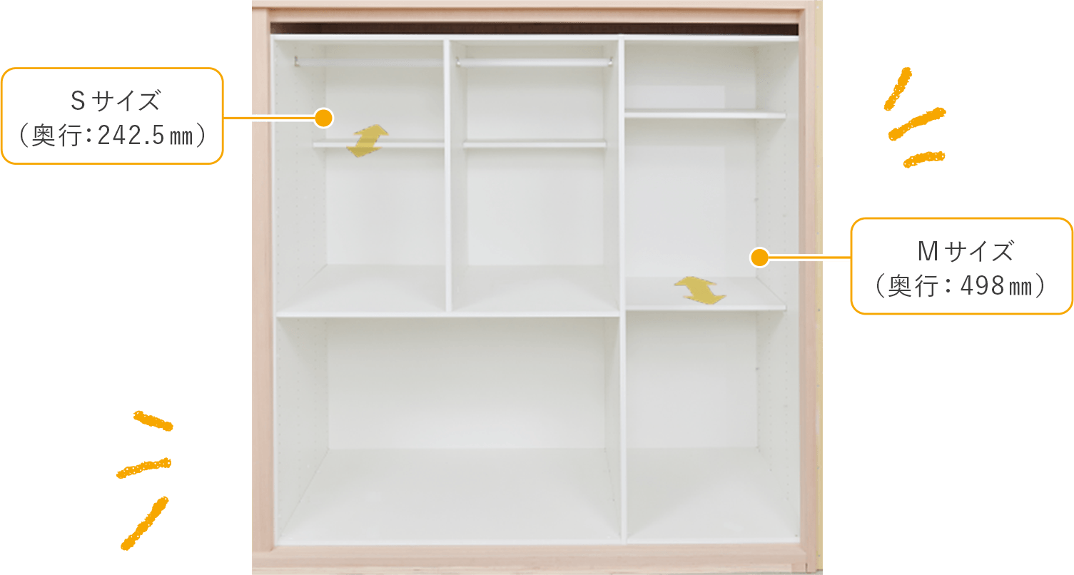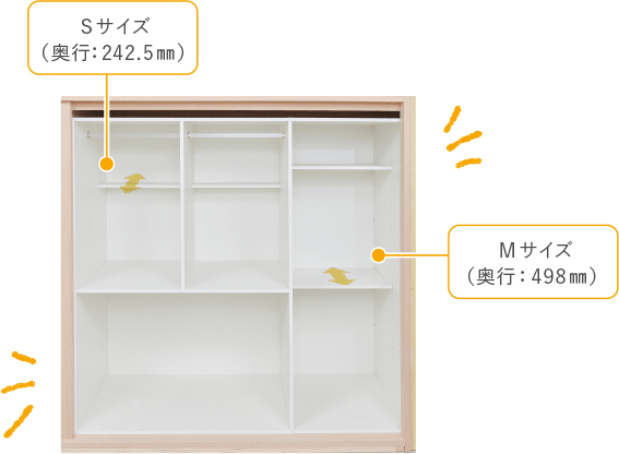 手前はハンガースペース、奥はSサイズ棚板のスペースにします。